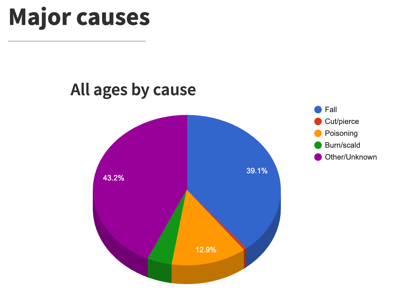 "About 44% of all fatal injuries are due to Home and Leisure Accidents. The remaining injury deaths are related to suicides (28%) road traffic (15%), homicide (3 %) and paid work (2%). All together, every year around 235.000 people die due to accidents, self harm and violence” -EuroSafe